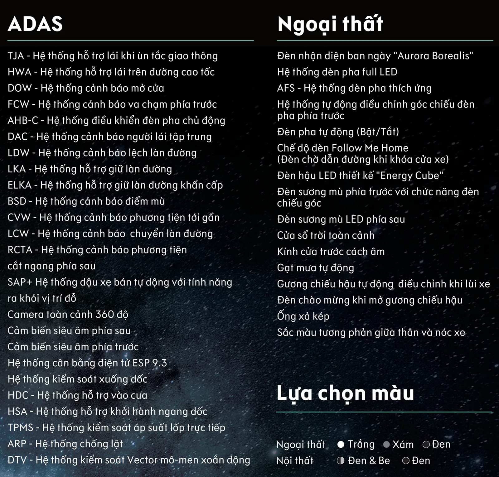 - Giải pháp hỗ trợ lái xe thông minh: Xe được trang bị 12 radar siêu âm, radar sóng 5 mm, 4 camera quan sát xung quanh độ phân giải cao và 1 camera quan sát phía trước có độ chính xác cao