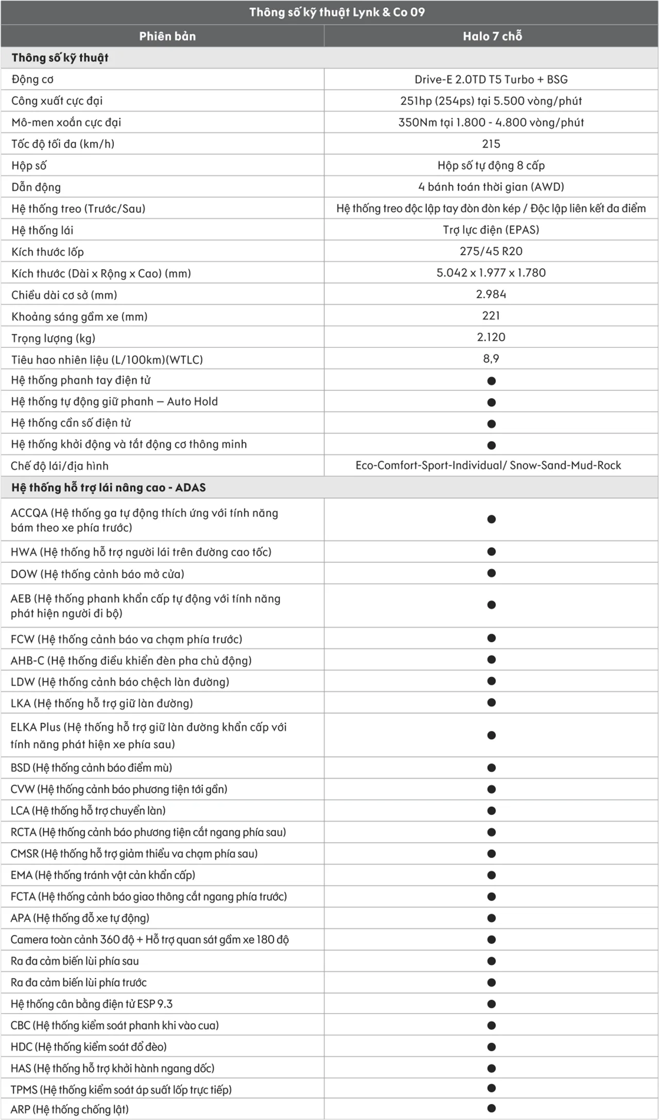Thông số của Lynk & Co 09